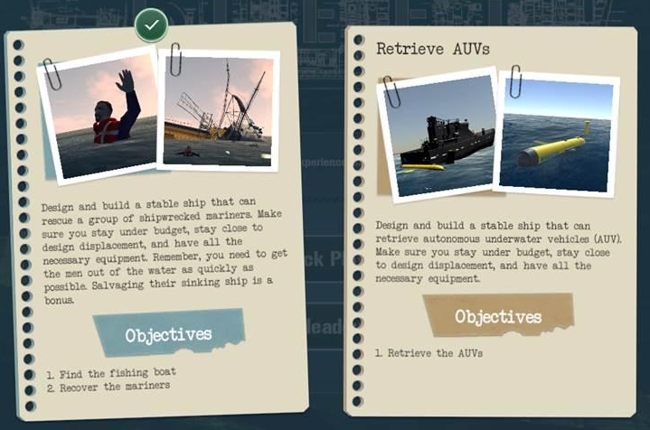 While you design your ship, be sure to keep an eye on ship stability and ship arrangement, similar to the Search and Rescue Mission. The tall radar towers can help pinpoint the location of the AUV’s faster, but they are also much less stable designs. Every design decision will affect how your ship cruises at sea.